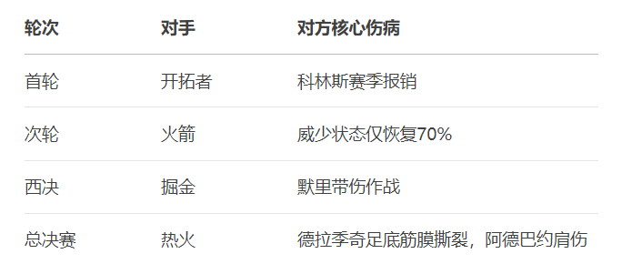 季后赛期间共有9支球队至少缺少1名核心球员,而湖人核心阵容保持完整。